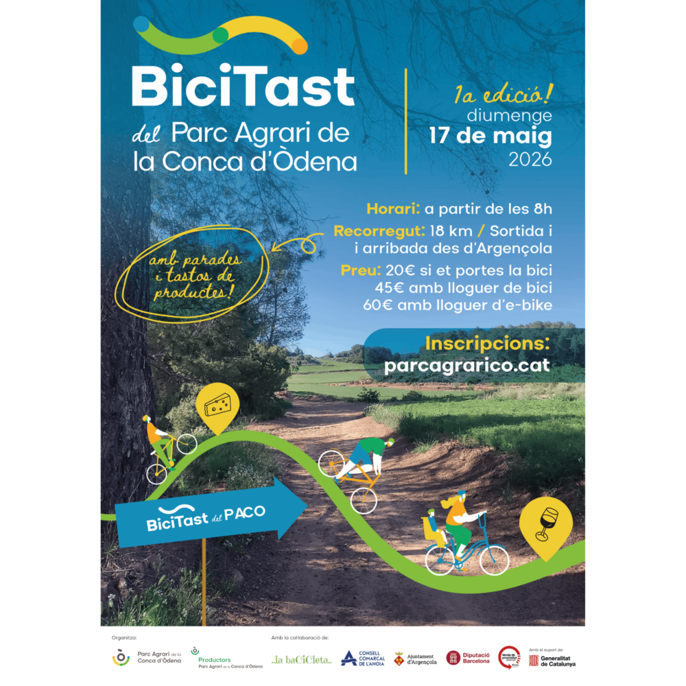 El Parc Agrari de la Conca d’Òdena i els seus productors, amb la col·laboració de l’Ajuntament d’Argençola, el Consell Comarcal de l’Anoia, La Bacicleta i la Diputació de Barcelona, i amb el suport de la Generalitat de Catalunya, et conviden a viure una experiència única: la primera edició del BiciTast, que tindrà lloc el pròxim diumenge 17 de maig.