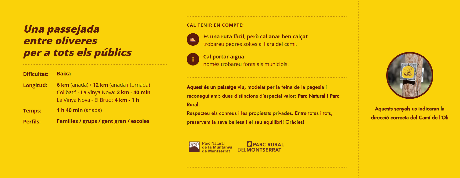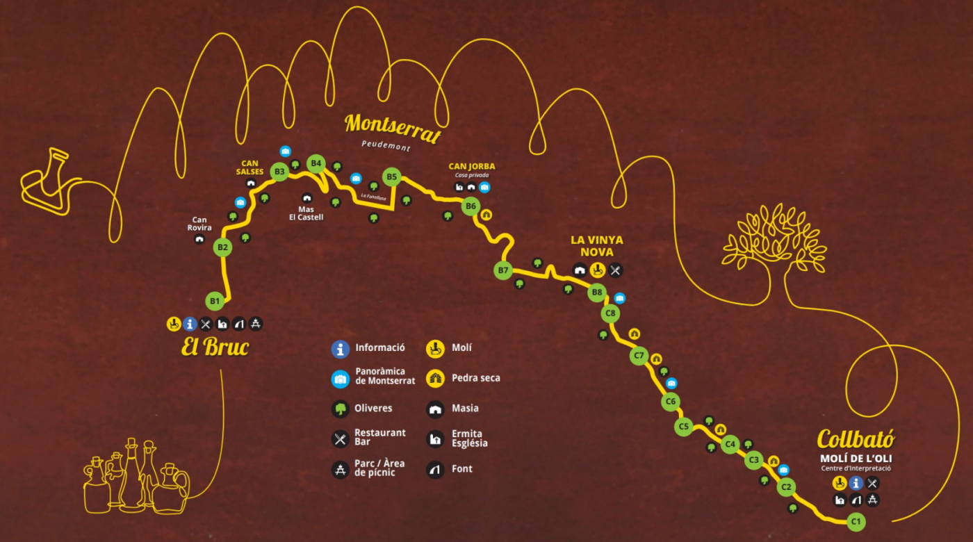 El Camí de l’Oli és una ruta de 14 quilòmetres i de baixa dificultat que connecta El Bruc i Collbató a través de camps d’oliveres i elements característics del paisatge, com els murs de pedra seca. Aquest itinerari es concep com un espai interpretatiu a l’aire lliure que permet aprofundir en la tradició oleícola i en la relació històrica del territori amb aquest sector.