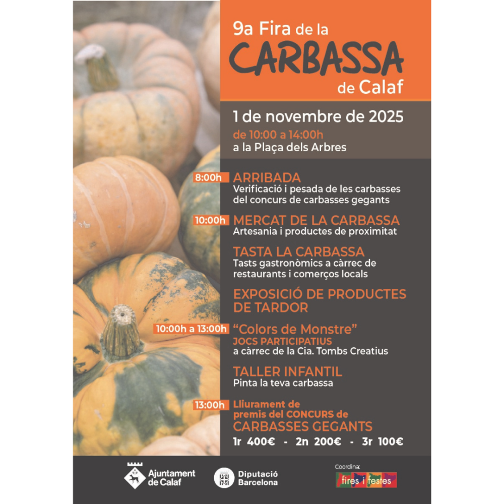 Per Tots Sants, el divendres 1 de novembre, Calaf acollirà la 8a Fira de la Carbassa. El certamen tindrà lloc a la plaça dels Arbres durant el matí de 10 h a 14 h. La programació i el plat fort de la festa serà el “Concurs de carbasses gegants” que començaran a arribar, pesar-se i exposar-se a partir de les 8 h.